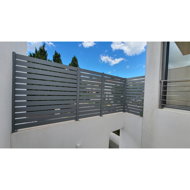 Voici ci-dessous un exemple de brise-vue posé en hauteur sur un muret avec des espacement de 2 cm - RAL 7037 Texturé.